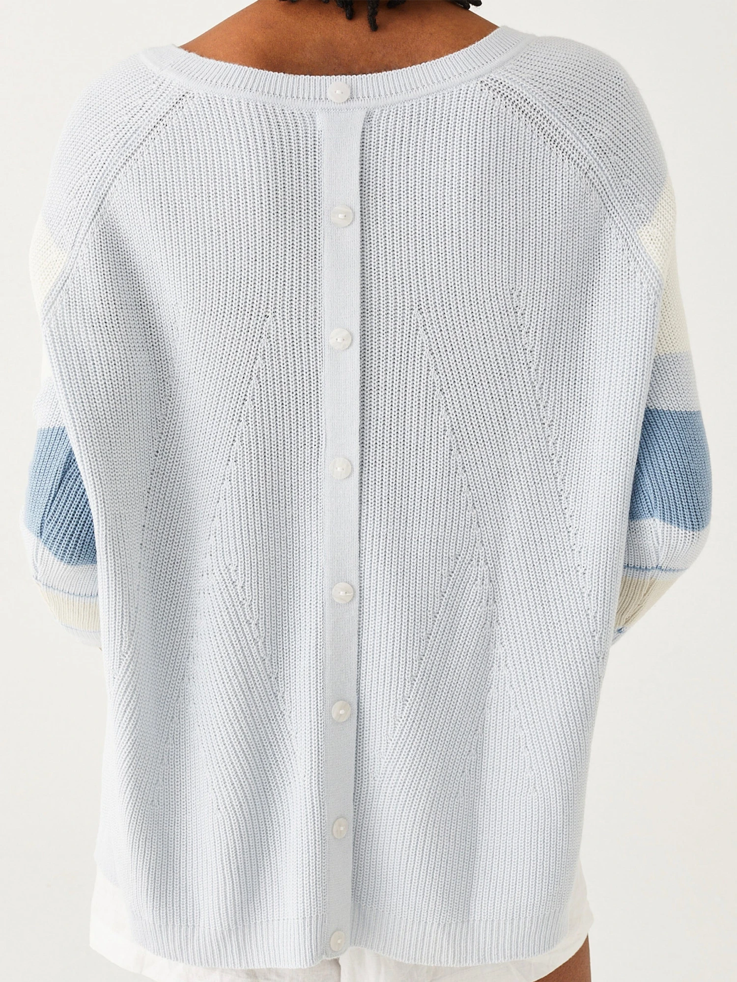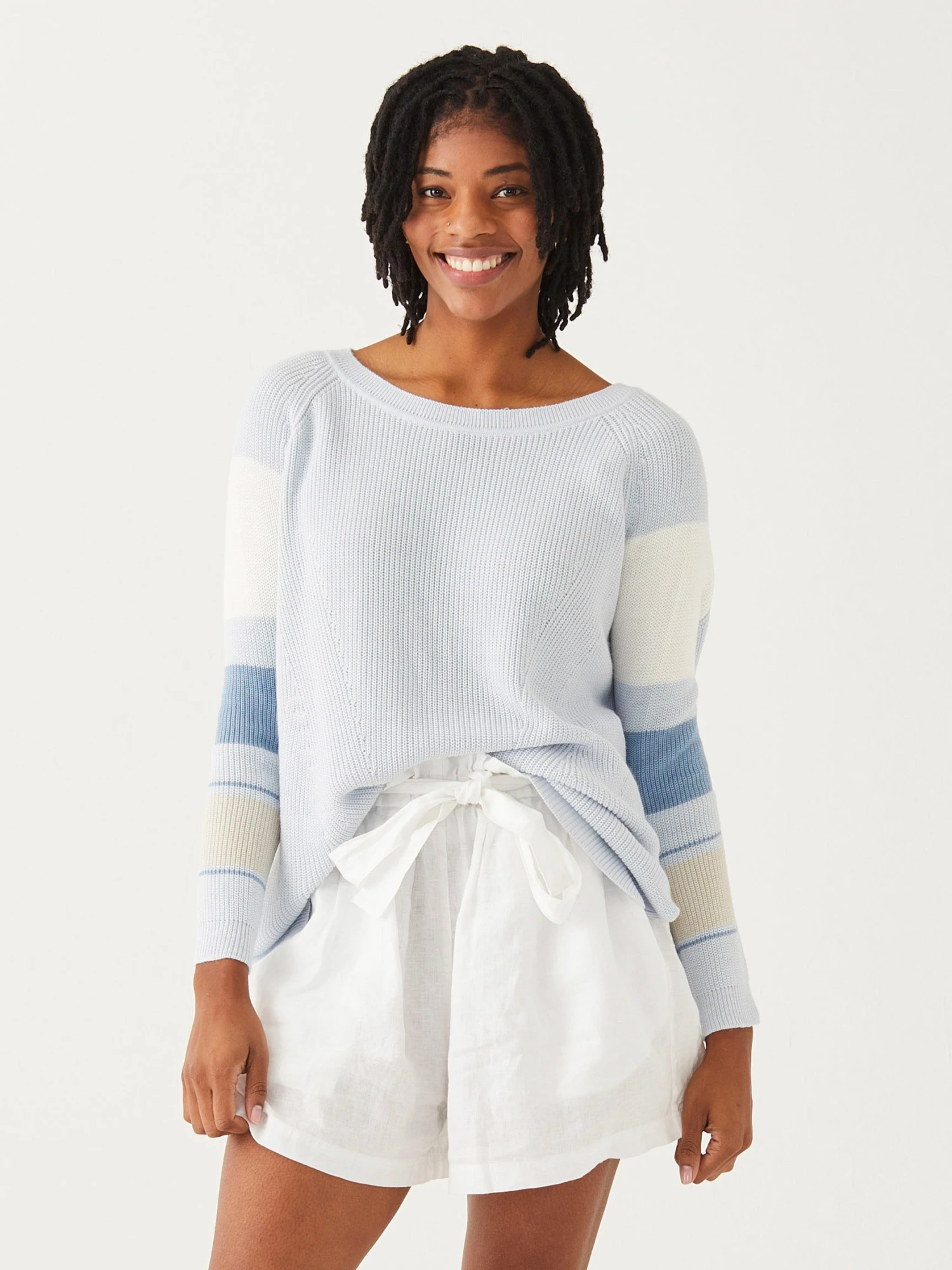 Have you ever been to this little town in Maine? If you have, you will know why we named one of our favorite sporty travel sweaters after this mid-coast gem. Our Camden Striped Traveler is a medium-weight knit that takes on summer with perfect form. With its round neckline and refined casual design, this is a perfect go-to piece for your next Zoom call or outing on a boat. Wear as-is or over your favorite tee—the details are all in back with its happy little summarys and side slits for easy movement.