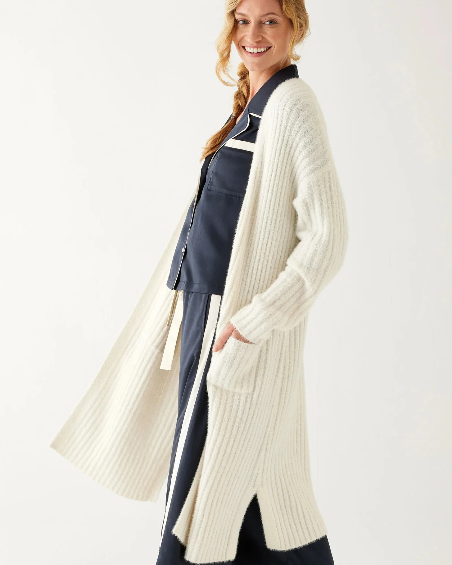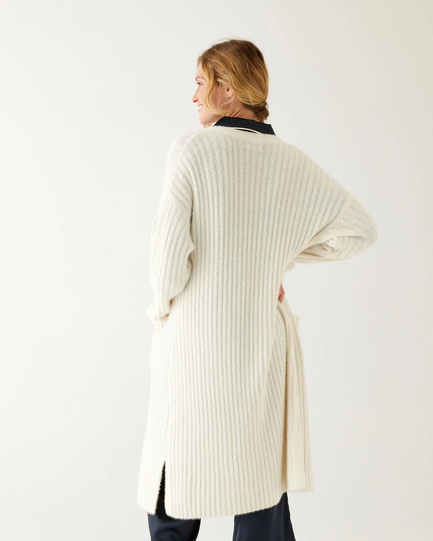 – Features side slits and front pockets