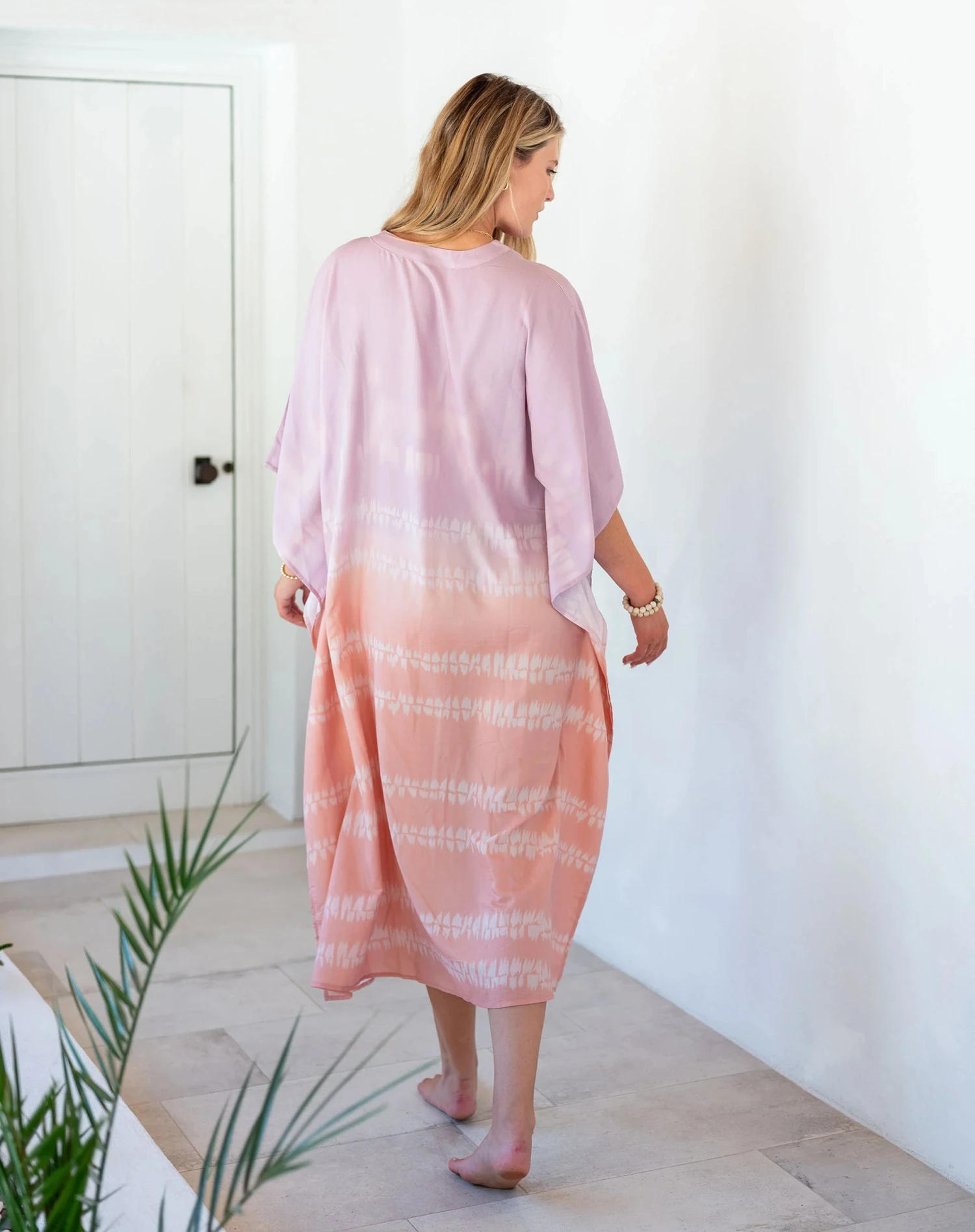 Inspired by traveling to warm places around the world, this silhouette feels exotic and summery, making it the perfect cover-up. The light, flowy material has a flattering shape, with a deep V-neck and side slits. The Palm Springs Kaftan is effortlessly chic at the beach.