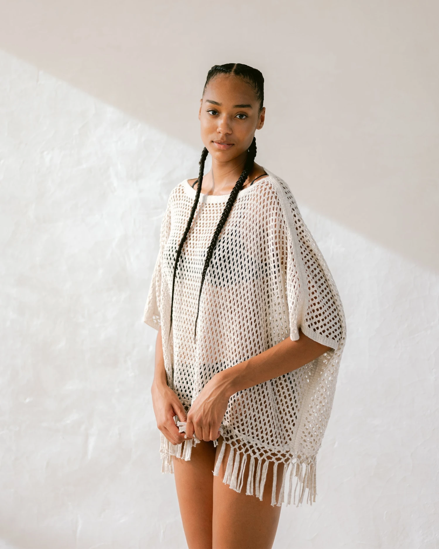 – An open crochet-knit with woven fringe detailing