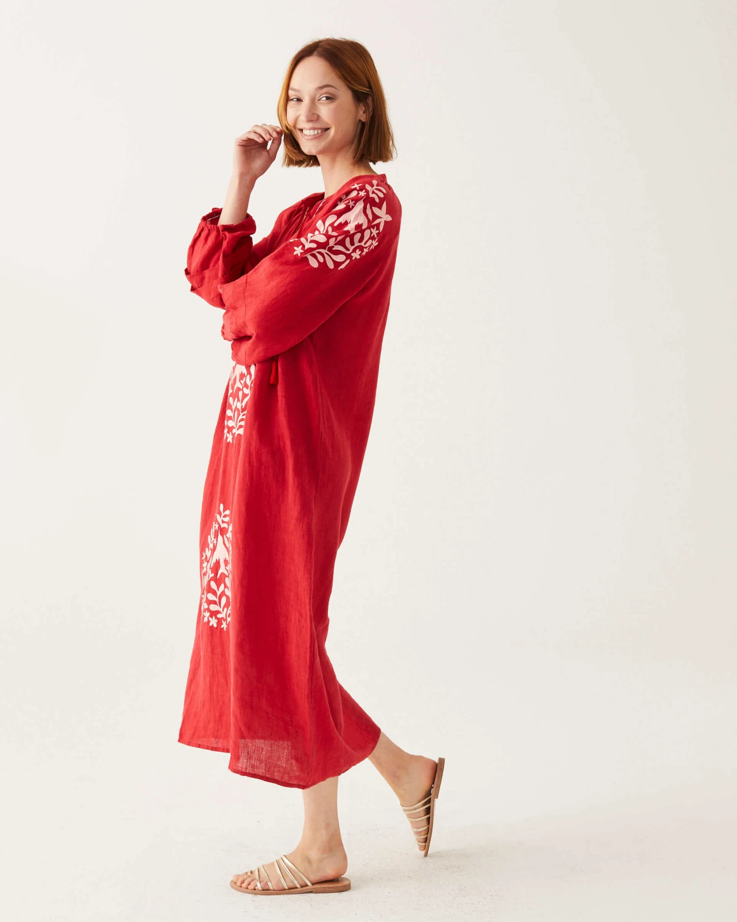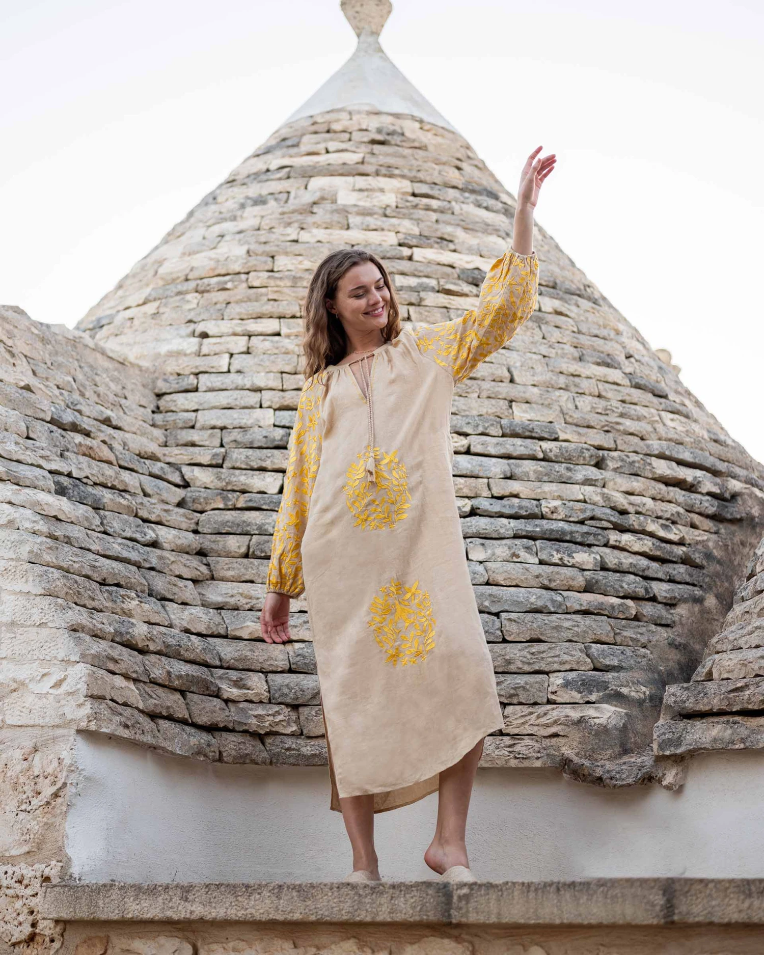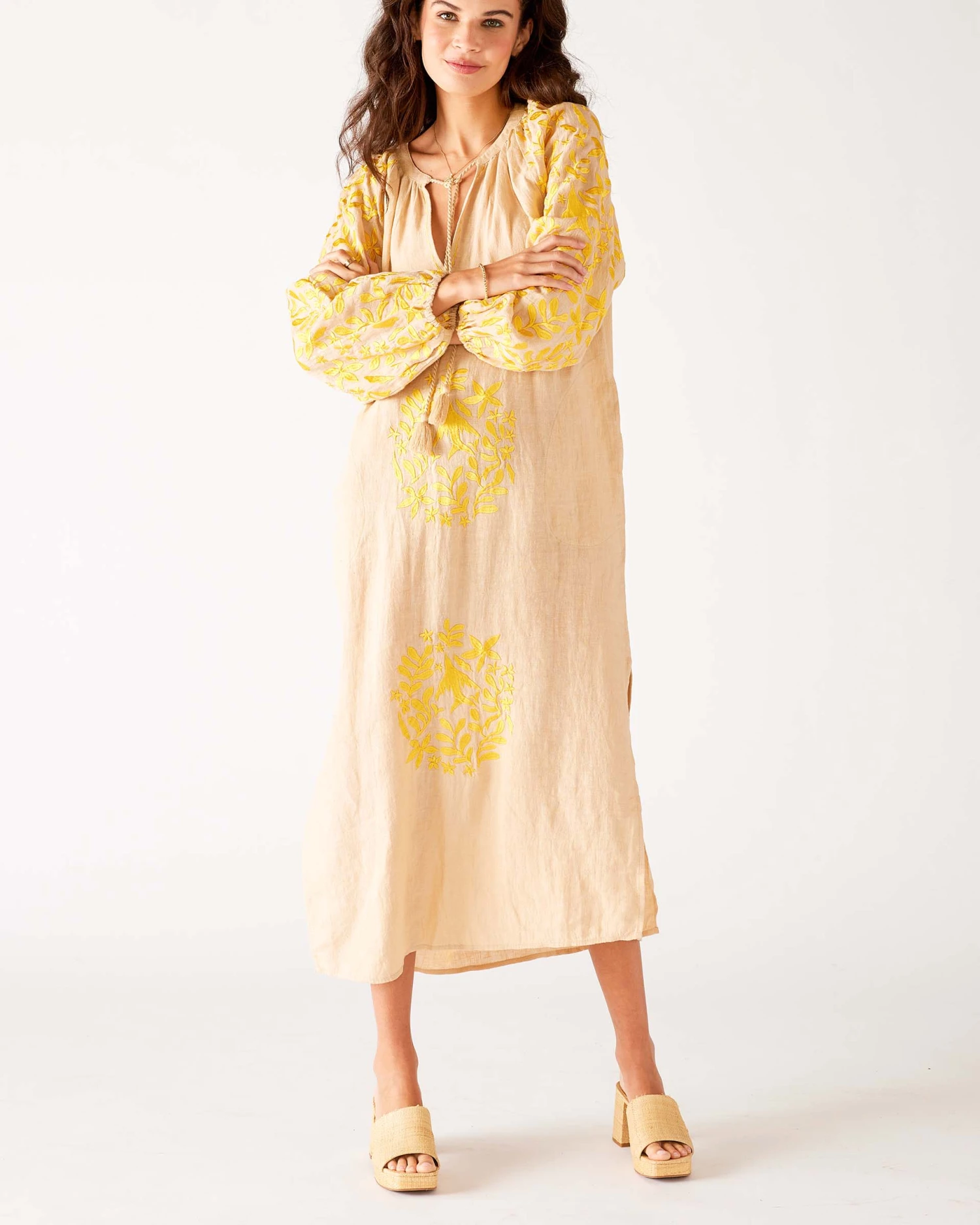 Our Palermo Maxi Dress comes intricately embroidered with vines, flowers and birds inspiring us to follow nature’s way. The tan linen and yellow stitching are the soothing, earthy tones you need this summer for exploring cobblestone streets, sitting by the pool and dining on the patio. With elastic cuffs, tassel ties and a v-neckline, you’re sure to be the most comfortable and well-dressed.