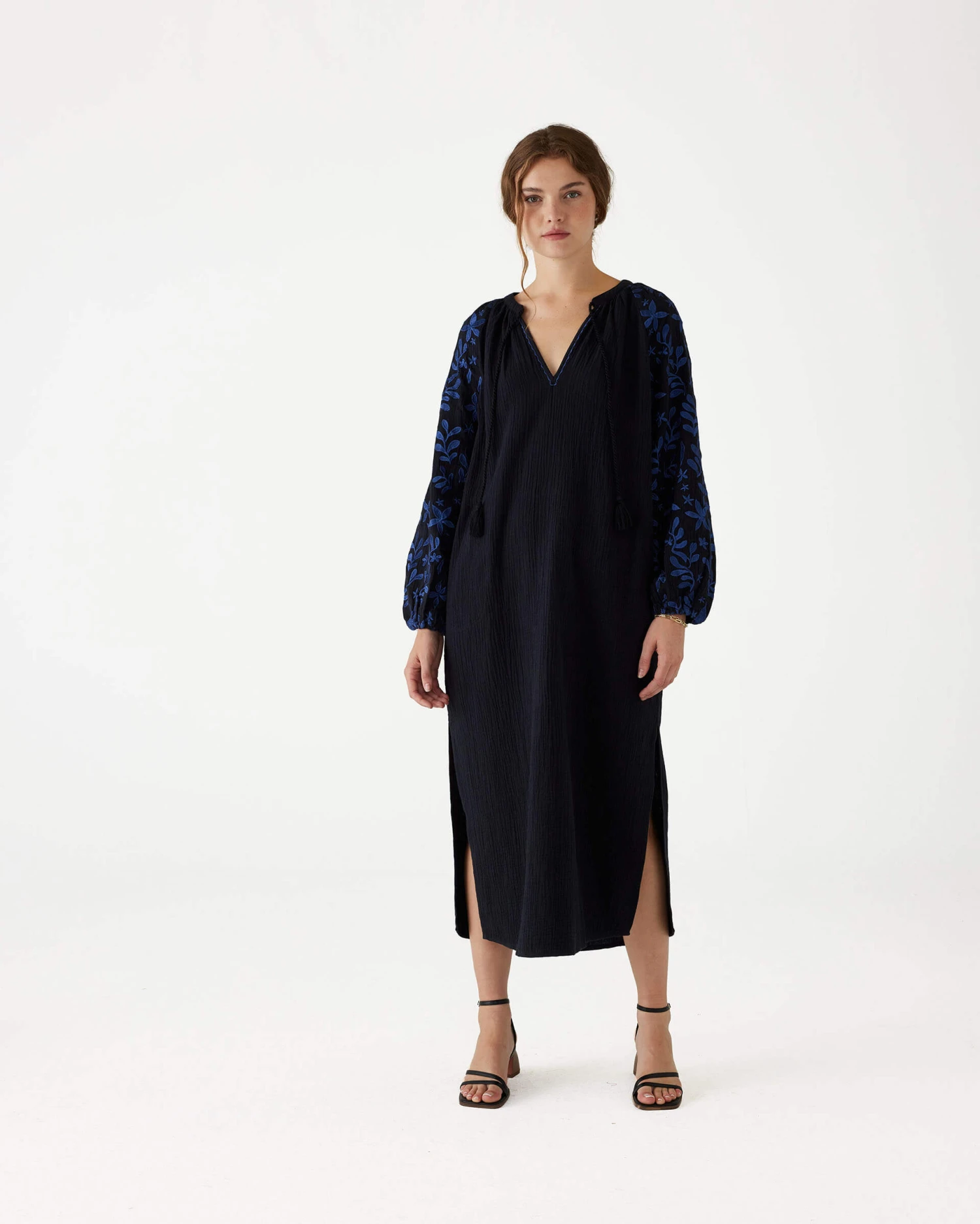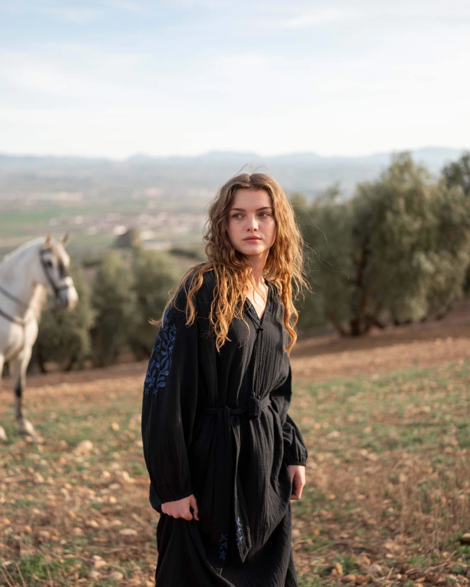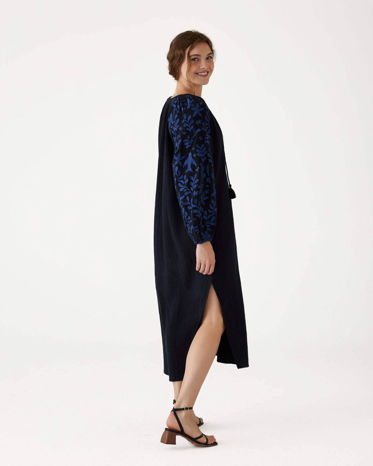 Our Palermo Maxi Dress comes intricately embroidered with vines, flowers and birds inspiring us to follow nature’s way. The tan linen and yellow stitching are the soothing, earthy tones you need this summer for exploring cobblestone streets, sitting by the pool and dining on the patio. With elastic cuffs, tassel ties and a v-neckline, you’re sure to be the most comfortable and well-dressed.