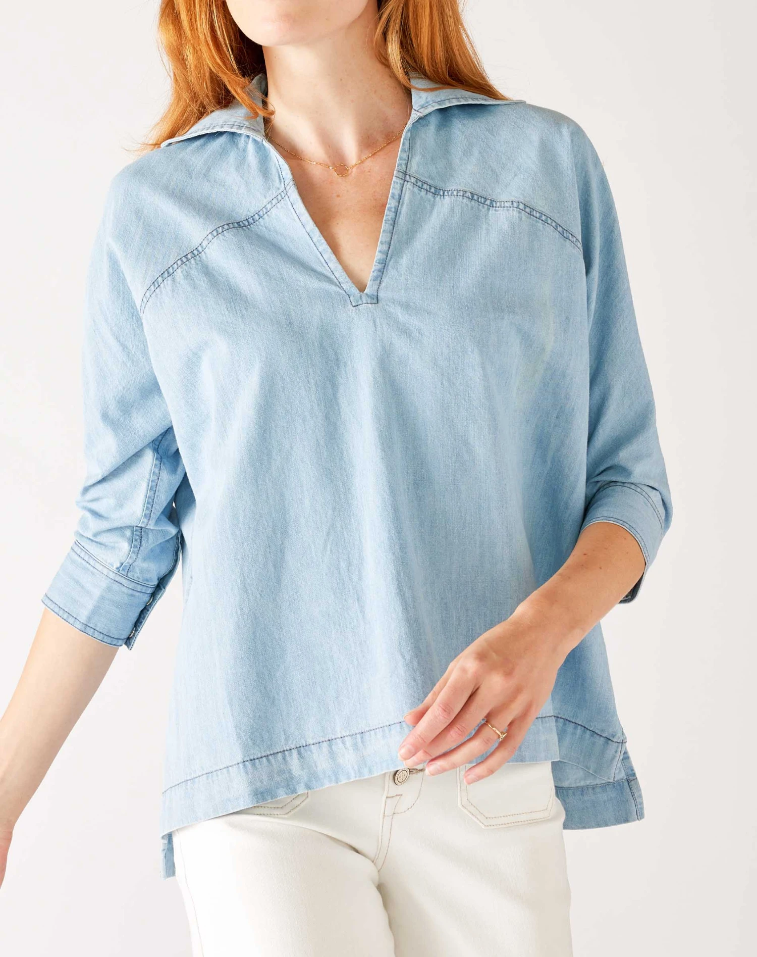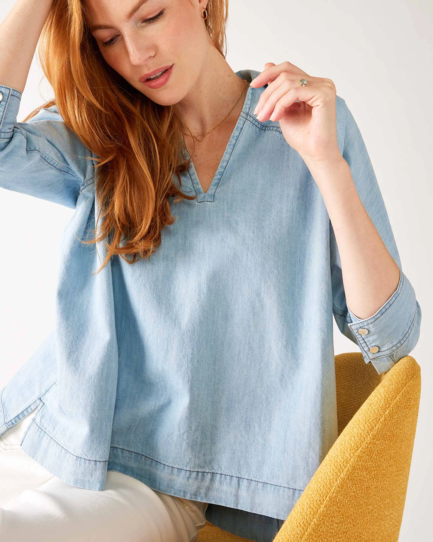Have you met our chambray? Our newest addition is this Poppy Popover Top—a classic v-neck collar, relaxed fit and cuffed sleeves with a faux pearl snap detail. Made with 100% cotton, this piece is comfortable and travels from season to season with ease. Wear this as a set with the Sammie Chambray Pant, or dress it up on its own—we can’t get enough of this style.